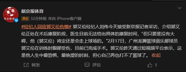 经纪人回应郭艾伦伤势:正处康复阶段医生无法给出具体康复时间