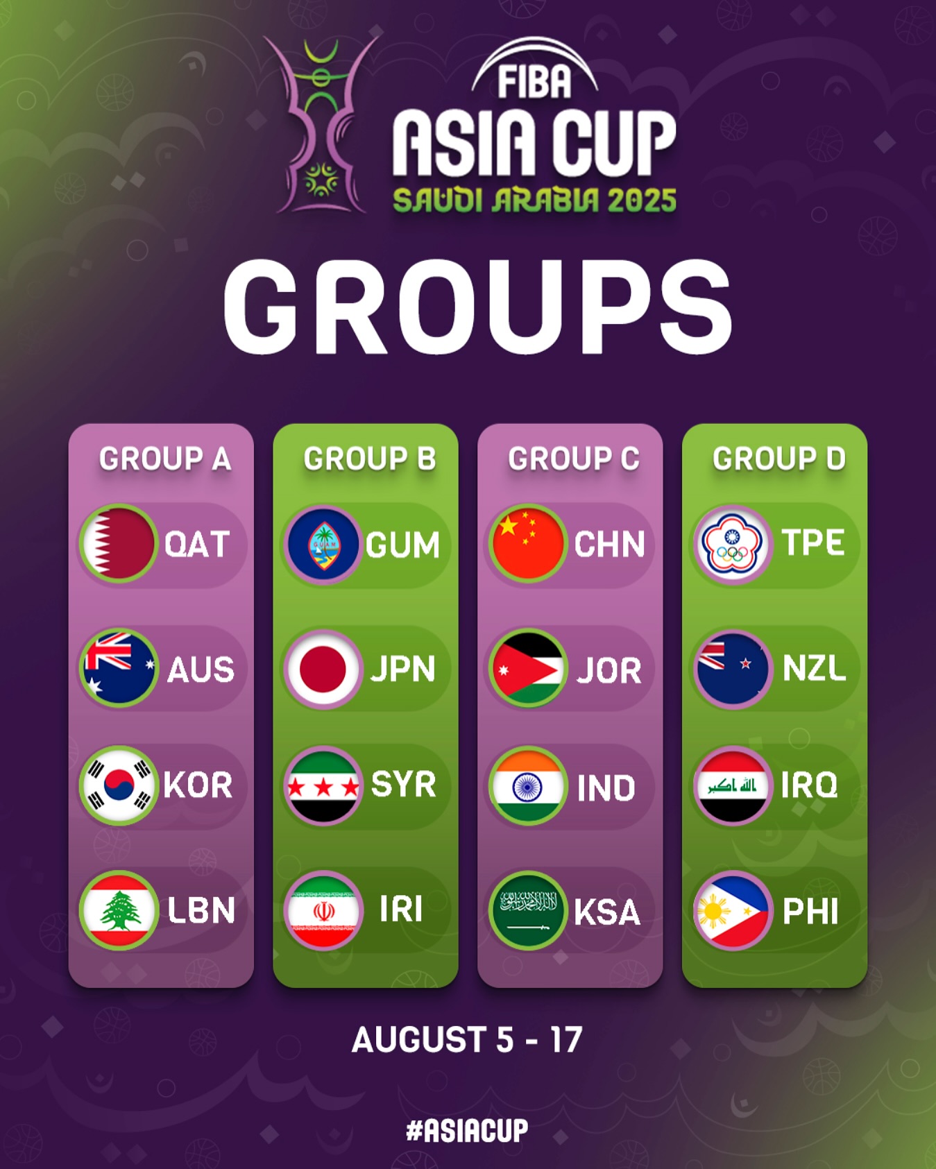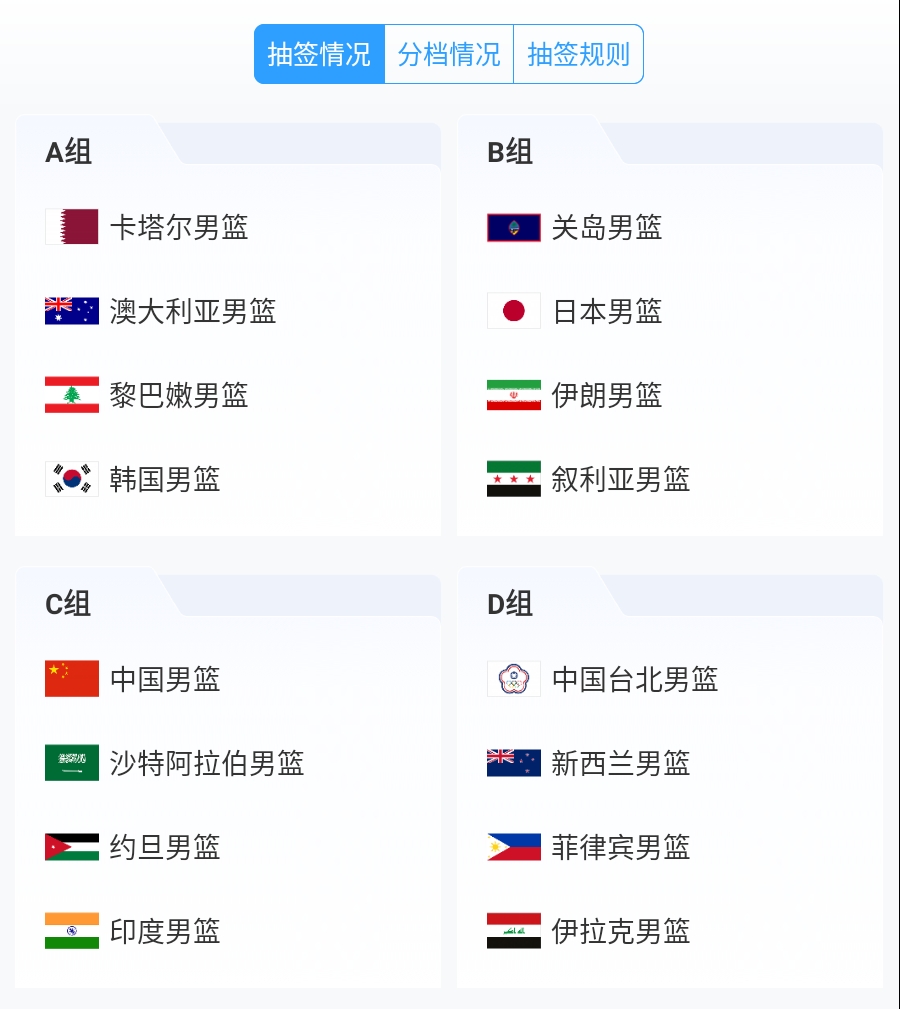 2025男篮亚洲杯分组出炉:中国男篮和沙特约旦印度同组