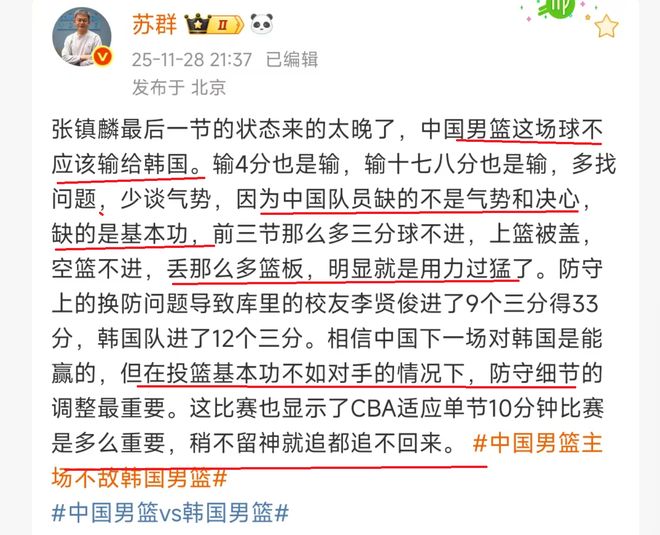 输韩国4分!苏群中肯点评,指出了中国男篮输球的主要原因