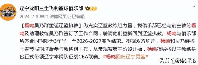 北京时间1月26日,根据辽篮官方社媒的公示,功勋名帅杨鸣卸任主帅位置,助理教练乌戈再次接任,对于现阶段的辽篮,是否意味着是主动求变的信号。