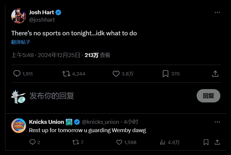 12月25日讯 今日无热门体育赛事,哈特表示很无聊:“今天没比赛看,我不知道该干嘛了......”最高赞网友回复写道:“好好休息,明天你要防守文班亚马兄弟!”明日凌晨1:00,NBA圣诞大战,尼