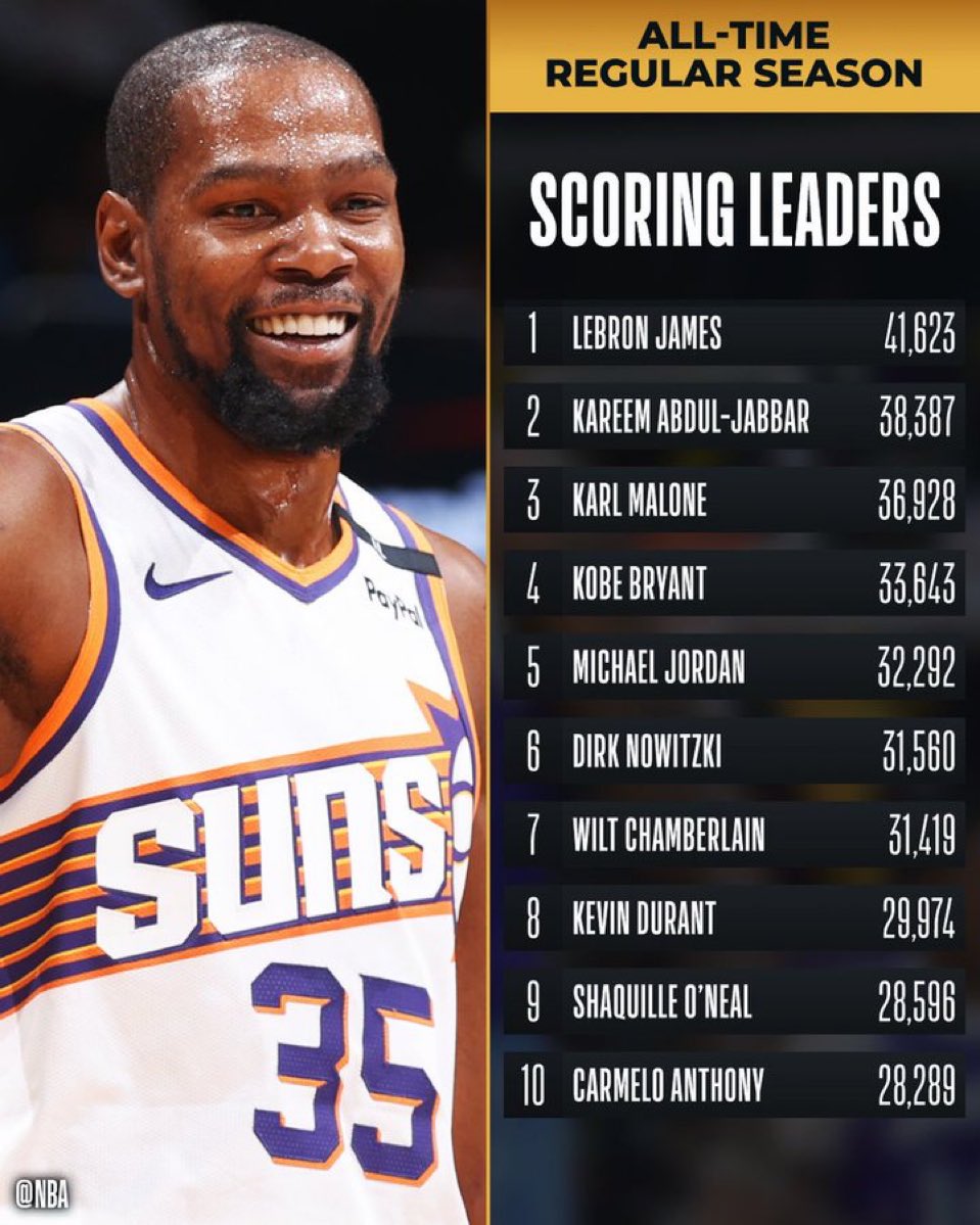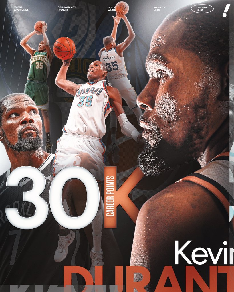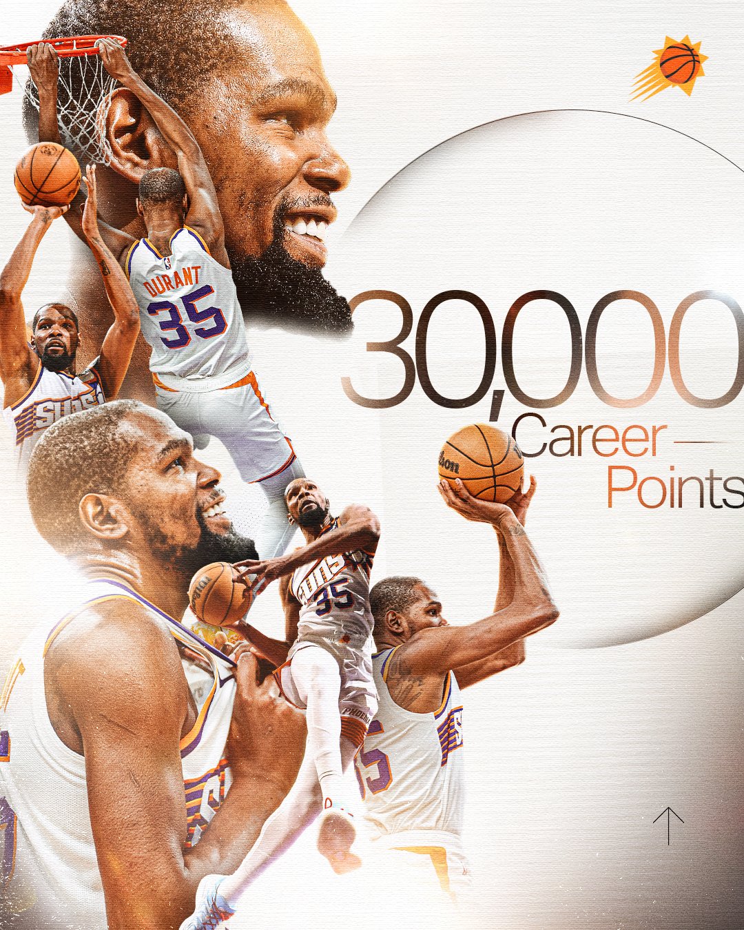 02月12日讯 NBA常规赛,太阳112-119不敌灰熊,杜兰特全场砍下34分3篮板3助攻1抢断5盖帽。这样,杜兰特职业生涯得分突破了30000分。在30000分榜单,杜兰特位列现役第二(詹姆斯第一),NBA