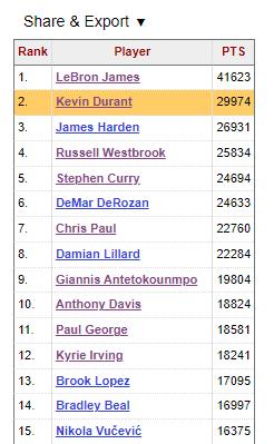 在30000分榜单,杜兰特位列现役第二(詹姆斯第一),NBA历史第八,前7是詹姆斯、贾巴尔、卡尔-马龙、科比、乔丹、诺维茨基、张伯伦。