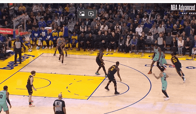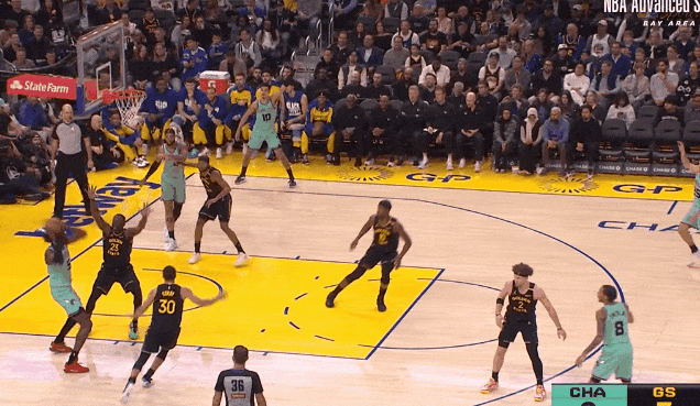 有趣的是,库里先招呼穆迪补弱侧,在吉米抄球瞬间,他还在招呼波杰补弧顶。