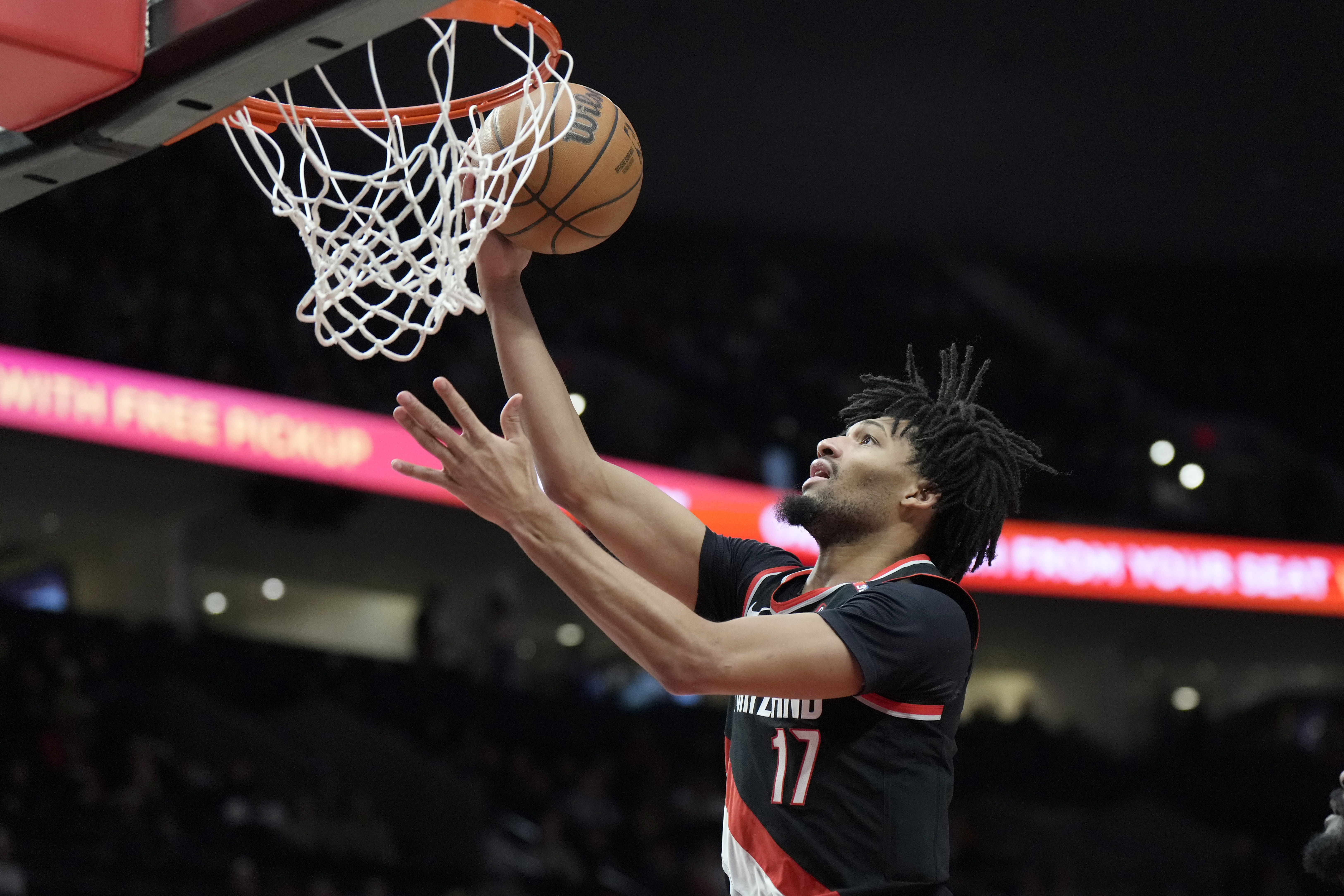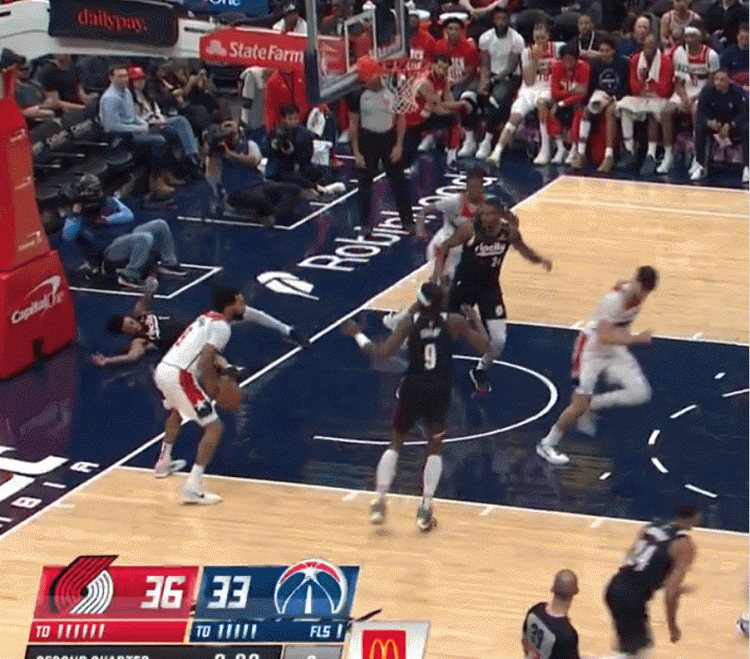 本场比赛开拓者球员夏普在前场抢断上演逆天隔扣,赛后他谈到这个回合说道:“我看到有人挡在前面,所以我就跳起来尝试扣篮,然后球进了。”