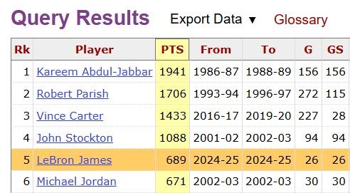 据统计,年满40岁以来,詹姆斯已经得到706分,已经超越迈克尔-乔丹(671分)排名历史第5位,NBA历史40岁以后得分最多的球员是贾巴尔1941分。
