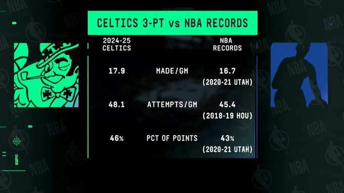 转播方晒出一组本赛季凯尔特人和NBA历史三分数据的对比: