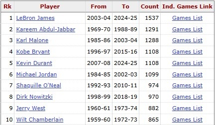 这是杜兰特生涯(常规赛+季后赛)第1109场单场20+,超越科比,独居历史第四,仅次于詹姆斯(1537)、贾巴尔(1291)和卡尔-马龙(1288)。