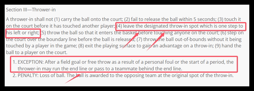 不过需要指出的例外是,在进球后或者因为犯规罚球罚进后或者每节比赛开始的回合发球者可以沿底线跑动,或者把球传给同在底线后方的另一名队友。