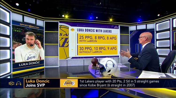 据统计,在东契奇加盟湖人后,在他和詹姆斯同时出场的比赛中,东契奇场均25分8篮板8助攻;在詹姆斯缺席的比赛中,东契奇场均30分10篮板9助攻。