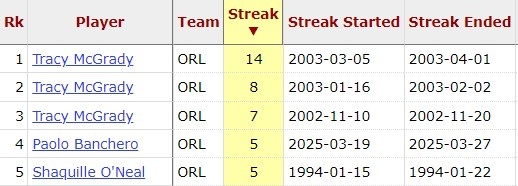 而魔术整个队史上,而仅麦迪、奥尼尔和班凯罗三人能连续5场30+。