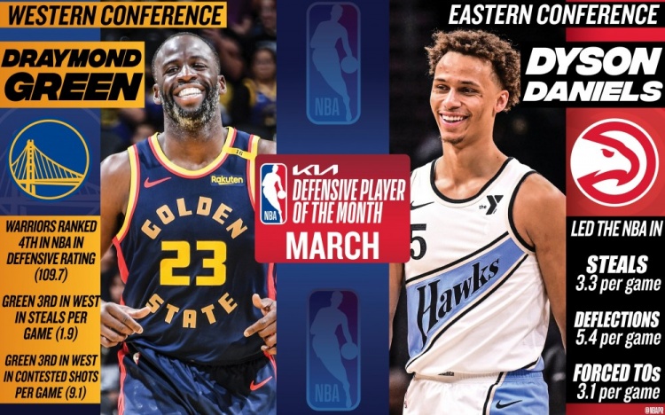 月最佳防守球员:西部追梦东部丹尼尔斯祖巴茨&多特等获提名