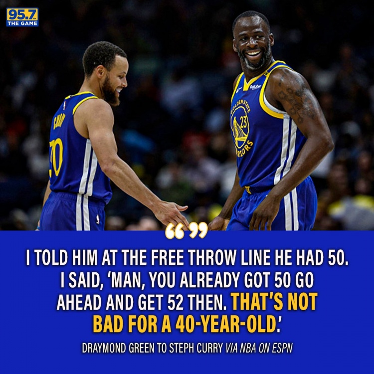 追梦调侃库里:50分了去再得2分吧对一个40岁老头来说还不赖