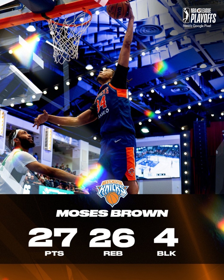 效力于威斯特彻斯特尼克斯的摩西-布朗本场表现炸裂,他出战37分钟,16投10中,罚球7中5拿下27分并狂揽26篮板,其中包括10个前场板,此外还有4盖帽入账。