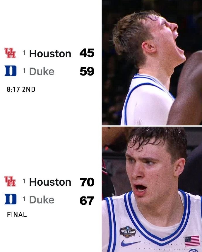 4月6日讯 NCAA疯三四强赛,休斯敦大学70-67逆转杜克,杀进决赛。