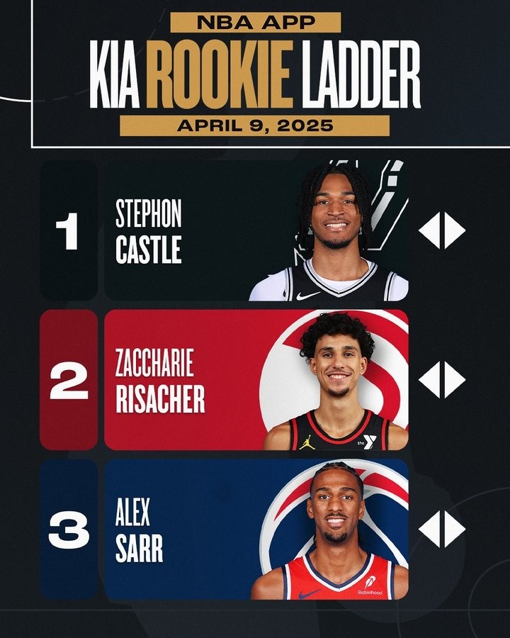 4月10日讯 NBA官方公布了本赛季最后一期的新秀榜,最后一期新秀榜仅列出了前三名,也就是可能入围最佳新秀候选的三位提名。其中,马刺新秀卡斯尔排名第一。
