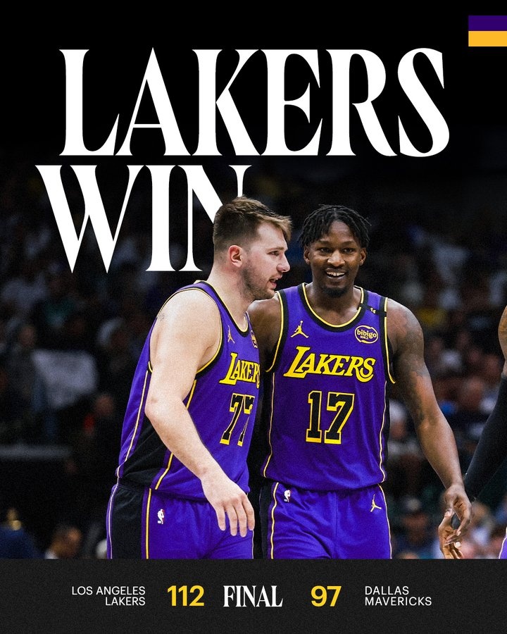 赛后湖人官方晒出赢球海报,击败旧主的东契奇和芬尼-史密斯登上封面。
