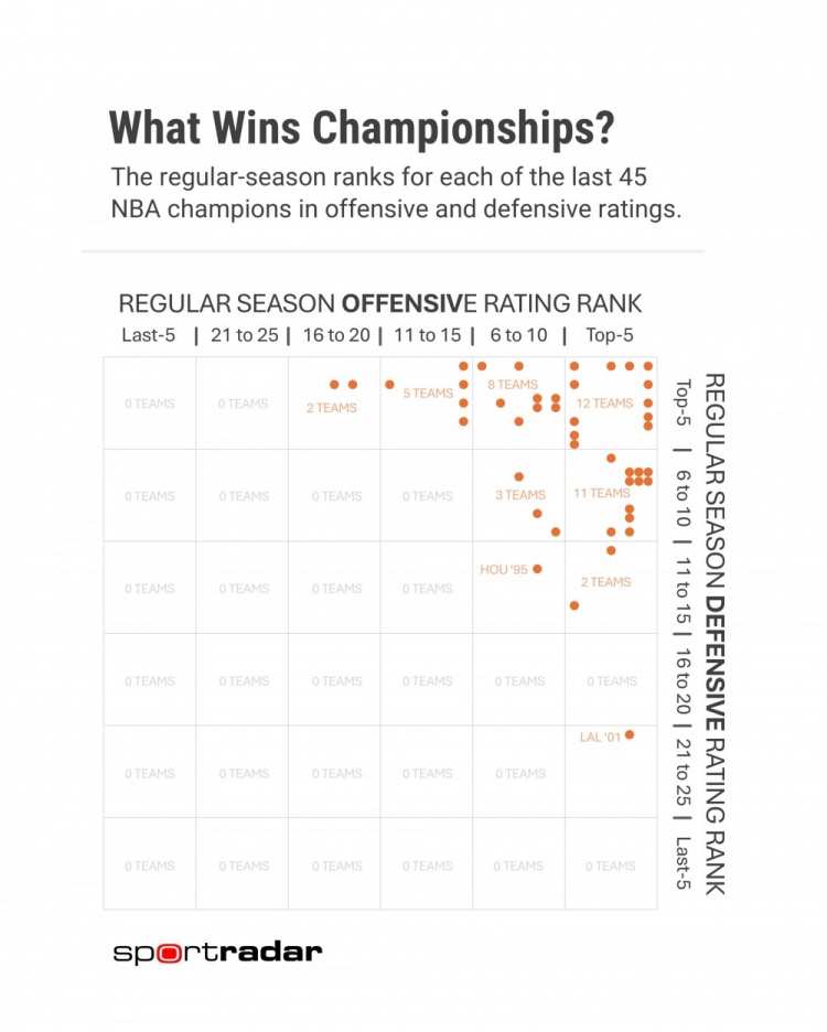 备注:横轴为近45队常规赛进攻排名、纵轴为防守排名。2001年湖人进攻联盟前五,防守排名在联盟20名开外。进攻排名在15名开外的只有2支球队。