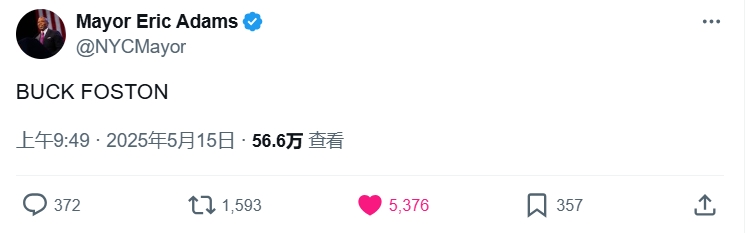 不是吹杨纽约市长发推:BUCKFOSTON!