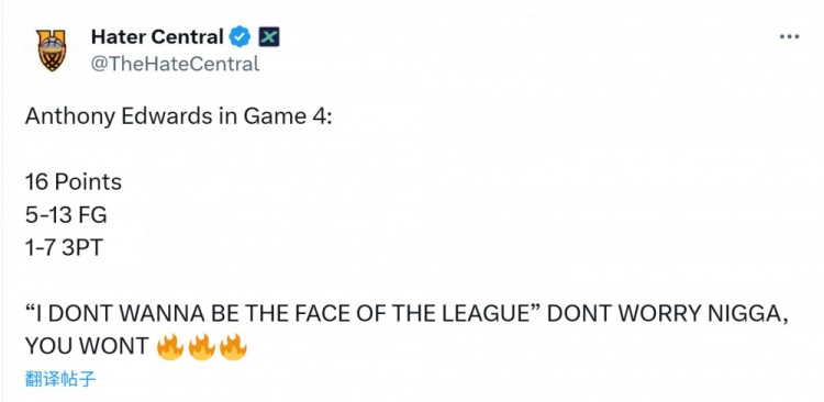 5月27日讯 西决G4,森林狼126-128惜败雷霆,大比分1-3落后。本场比赛爱德华兹发挥低迷,全场13投5中,三分7中1,罚球7中5拿到16分4篮板6助攻,出现5次失误。赛后美媒Hater Central晒出