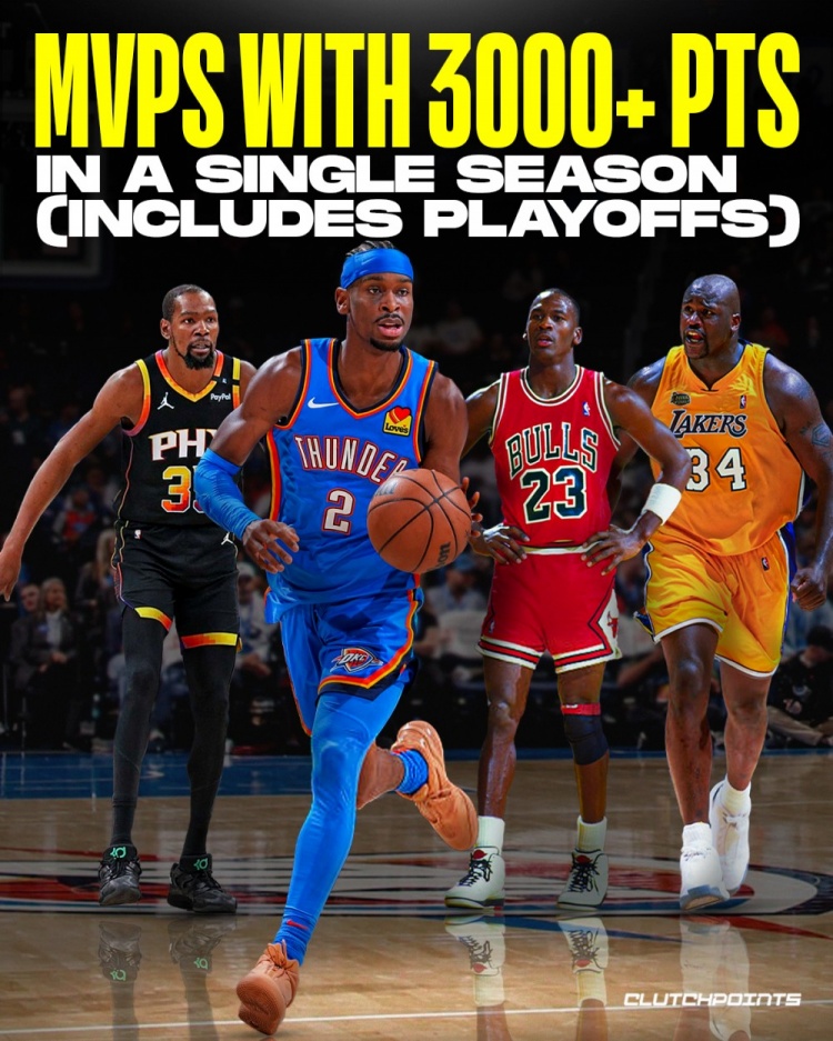 6月10日讯 据统计,本赛季当选MVP的亚历山大已经砍下了3000+的得分(包括常规赛与季后赛),是历史上第四位在当选MVP赛季,做到这一点的球员。