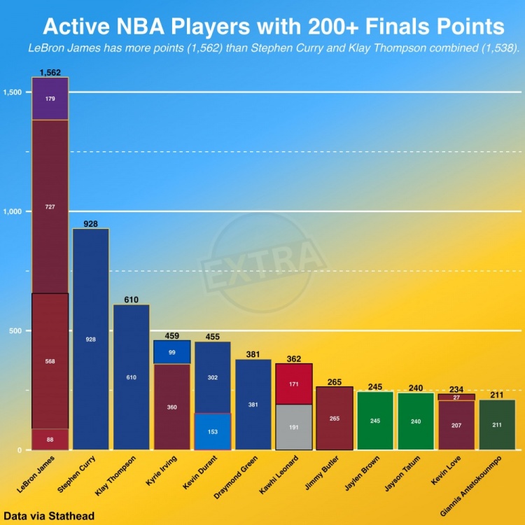 现役球员总决赛得分榜:12人200+老詹断档第1水花合体