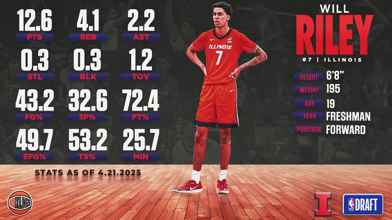 姓名:威尔-莱利(Will Riley)出生日期:2006年2月10日位置:后卫/前锋大学:伊利诺伊大学身高(裸足):2米04体重:84公斤臂展:2米05球员模板:雷迪什/阿巴基数据统计:2024-25赛季(大一),莱利出战35