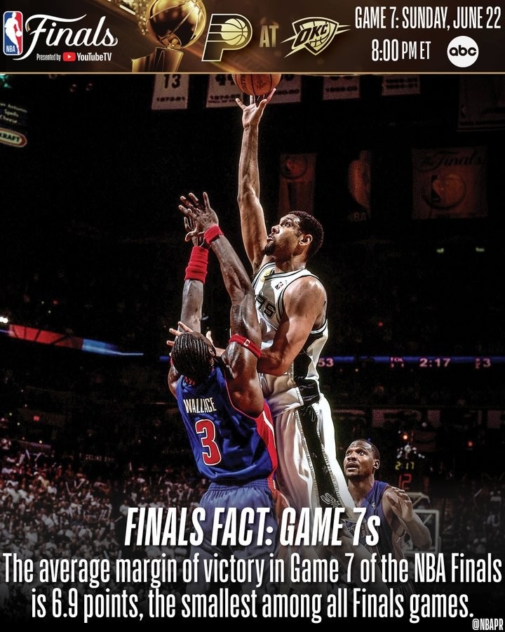 6月22日讯 明日雷霆和步行者的NBA总决赛将进行抢七大战,获胜者将夺得本赛季总冠军。NBA官方今天发布了关于总决赛抢七的数据,在总决赛抢七中,平均净胜分是6.9分,是总决赛历史上