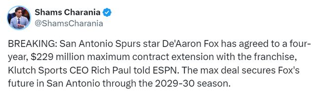 薪资专家Marks列出了福克斯新合同的详情:2026-27赛季的年薪5100万美元,27-28赛季年薪5510万美元,28-29赛季年薪5920万美元和29-30赛季年薪6330万美元。