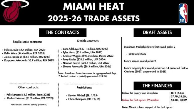 迈阿密热火刚刚完成了一笔堪称“NBA最冷血交易”——他们将刚刚做完半月板撕裂手术的海伍德·海史密斯和2032年次轮签打包送至篮网,换回一个几乎不可能兑现的2026年受保护次轮签(仅56-60顺位才归热火)。