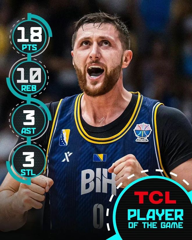 波黑队当家球星优素福-努尔基奇成为比赛关键先生。全场出战27分钟,13投6中,罚球12中6,得到18分10篮板3助攻3抢断1盖帽的全面数据,虽然出现5次失误,但他的正负值达到全队最高的+15。