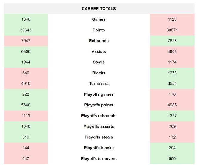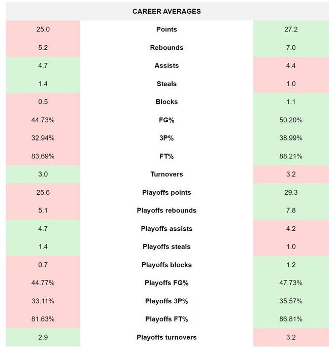 个人数据层面,杜兰特明显是更加全面,也是更加高效的得分手,随着生涯的继续,杜兰特完全有希望在总得分等方面完成反超。