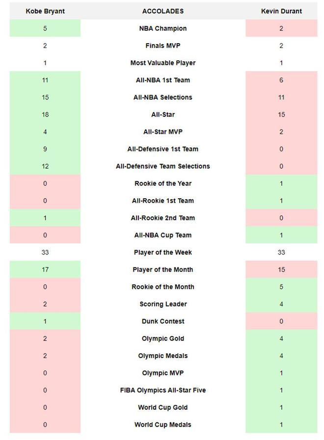 个人荣誉层面,杜兰特在NBA取得的成就远逊色于科比,但杜兰特凭借在国际赛场上更加全能的表现,依旧在整体荣誉上压制了科比。
