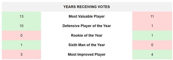 第八项:奖项获票次数(科比3:2杜兰特)