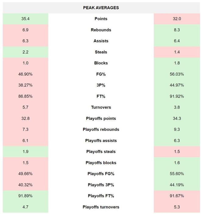第四项:各项巅峰数据(科比5:13杜兰特)