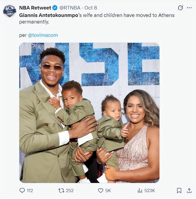 10月8日有媒体透露扬尼斯的妻子已经和他的孩子永久搬迁到希腊,而全美只有纽约存在直达希腊的航班。(此前扬尼斯的妻子与孩子都是居住在密尔沃基)