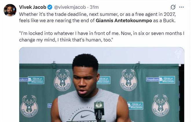 美记Vivek Jacob写道:从扬尼斯的言论来看,他身位雄鹿球员的生涯正在进入倒计时,无论是交易截止日、明年夏天还有2027年夏天,总之他将离开密尔沃基。