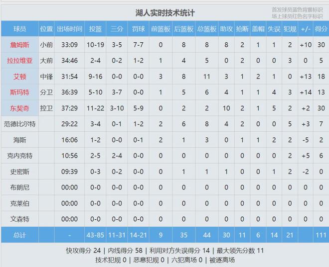 此役过后,湖人重返西部第三,胜场数和第四的掘金一样,领先第五的火箭0.5个胜场!最后看看数据,说说你的感受:
