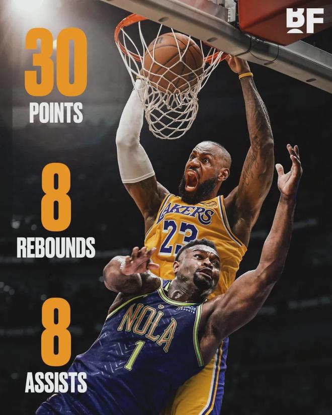 詹姆斯30分8板8助2断、东契奇30分2板10助2断,两人合砍60分10篮板18助攻。鹈鹕惨遭8连败,墨菲42分5板3助、锡安15分4板5助3失误、奎因10分13板8助2断4失误。墨菲打破生涯得分纪录,他也是鹈鹕交易价值最高的球员。