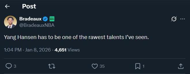 比赛期间,火箭队跟队记者Bradeaux发文称赞了杨瀚森的表现,他写道:“杨瀚森绝对是我见过最有天赋的球员之一。”