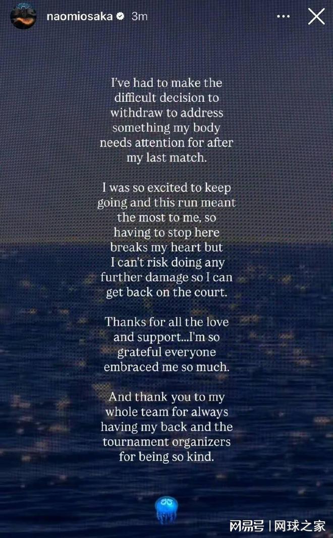 这位四届大满贯冠军得主在发文中感谢了球迷、团队和赛事主办方的支持,并表示期待未来重返赛场。