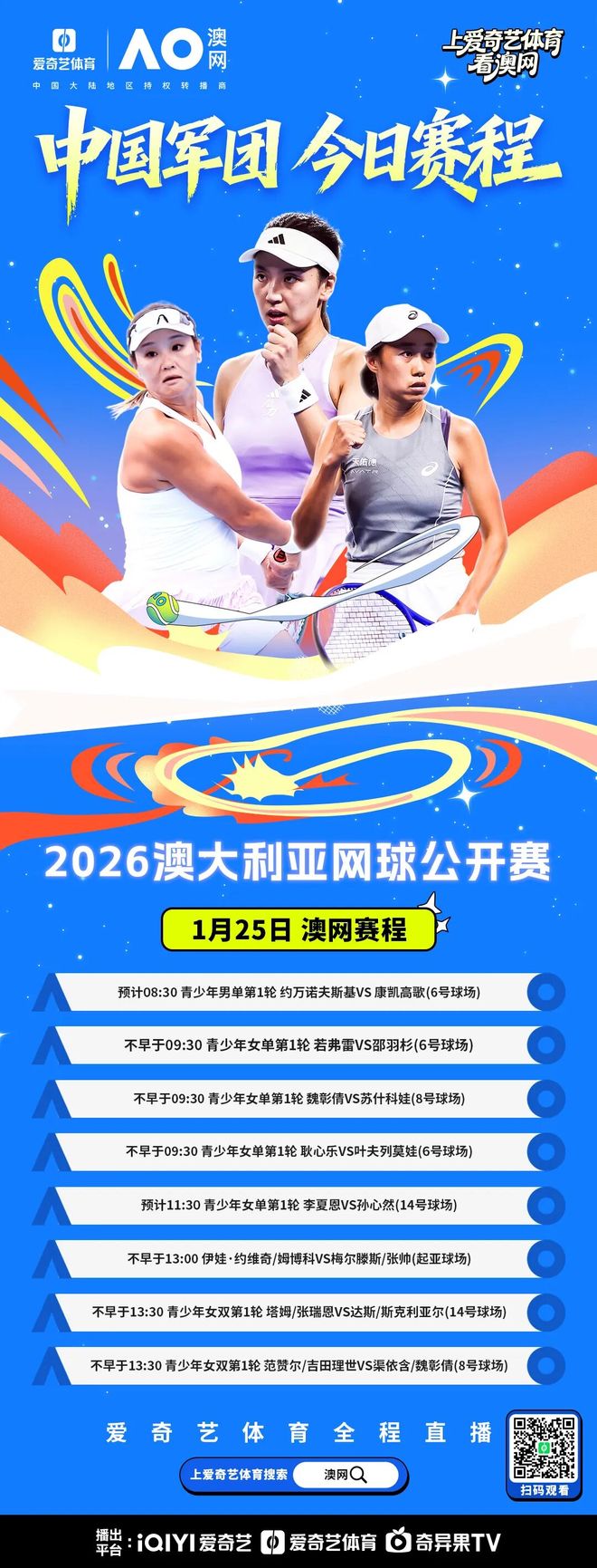 北京时间1月25日,2026澳大利亚网球公开赛第8比赛日将如期进行,爱奇艺体育将继续为您全程直播所有精彩对决。