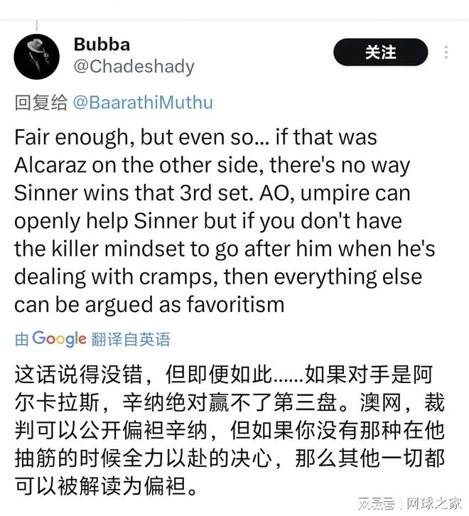 斯皮泽里的支持者们愤怒地指出,暂停恰好出现在辛纳最脆弱的时刻,这“过于巧合”地拯救了意大利人。社交媒体上,“规则干扰势头”的讨论迅速升温。有网友尖锐指出:“如果这是足球比赛,对手受伤倒地后重新开球,受伤方球员会立刻将球踢出界外以示体育精神,但网球规则没有这样的传统。”