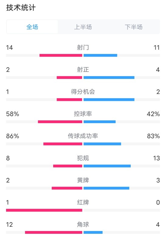 拜仁01勒沃库森全场数据:射门1411,射正24,控球率58%42%