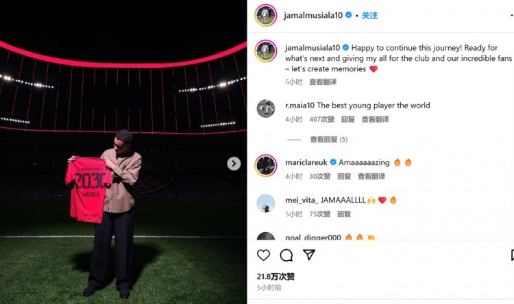 穆西亚拉晒出自己手持印有2030字样的拜仁球衣照,并表示:“很高兴能够继续这段旅程。已经准备好为我们的俱乐部以及令人难以置信的球迷们竭尽全力了!让我们共同创造更多美好的记忆吧❤️”。