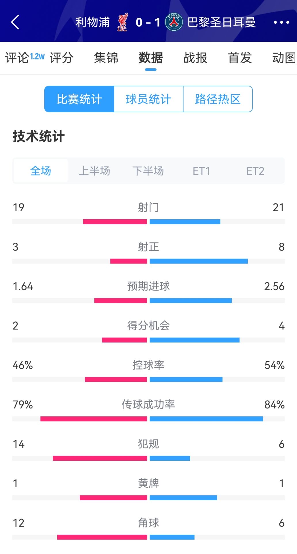 巴黎vs利物浦次回合数据,巴黎21脚射门↓