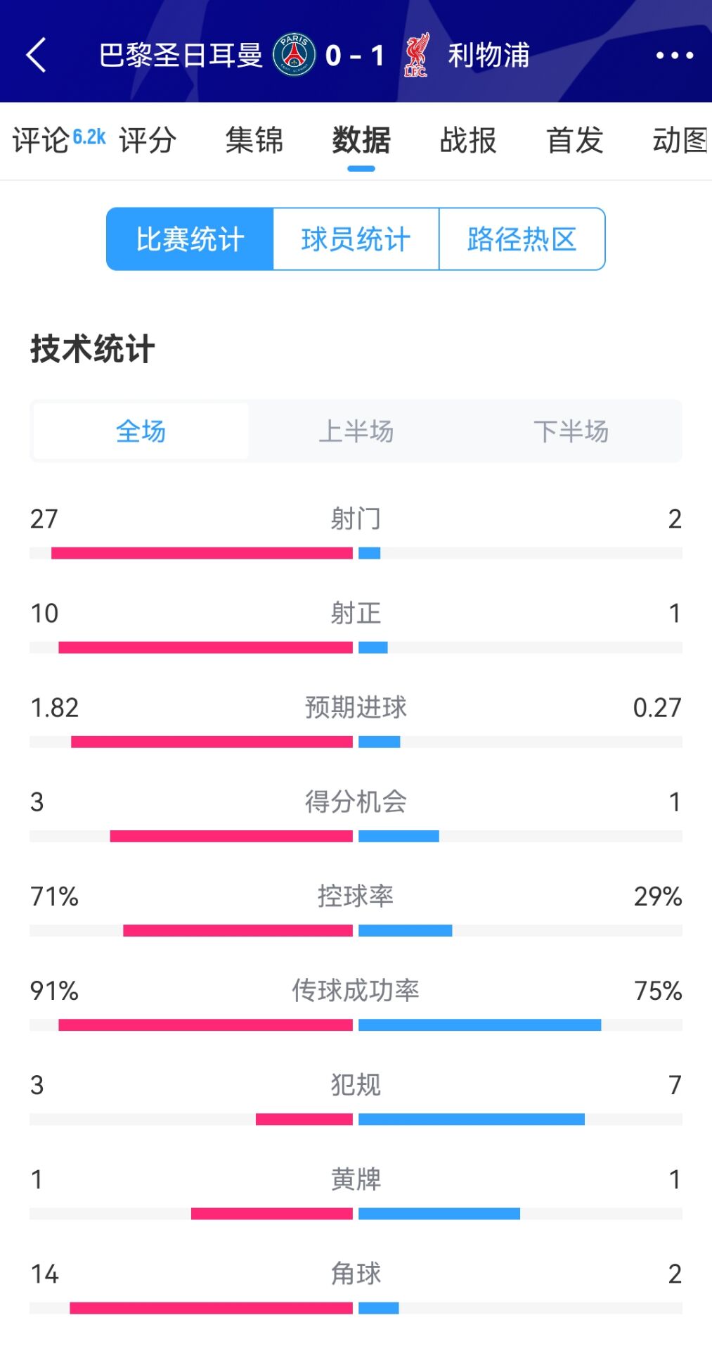 巴黎vs利物浦首回合数据,巴黎27脚射门↓