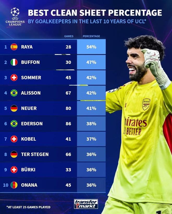 北京时间12月11日,德转列出了欧冠近10年出战至少25场比赛的门将零封率前10,阿森纳的戴维-拉亚以54%的零封率高居第一,布冯47%排名第二,索默和阿利松同以42%的零封率并列第三,奥纳