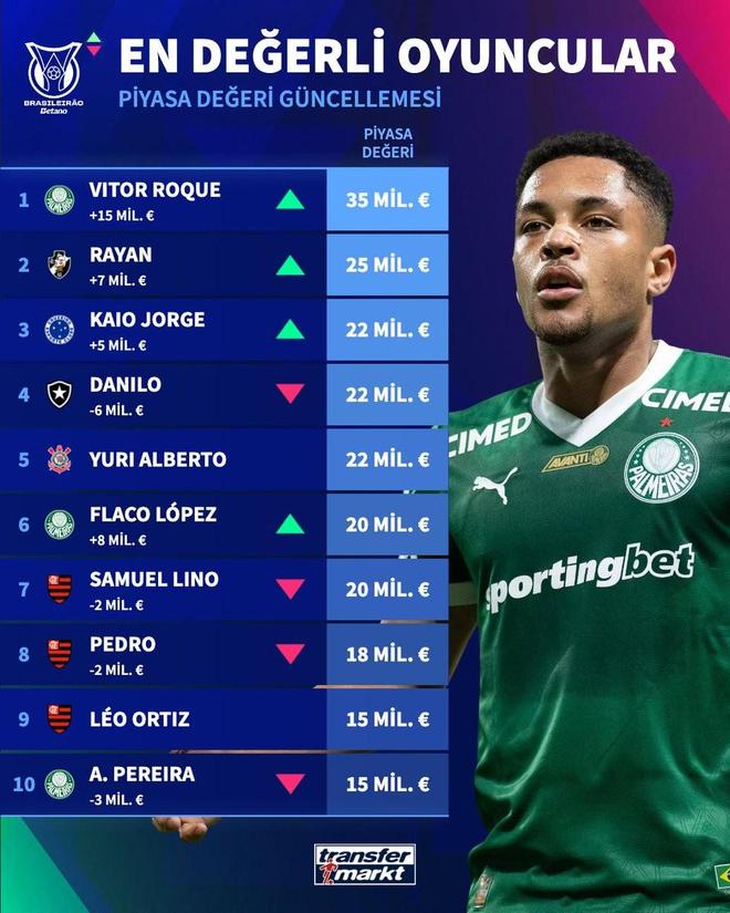 北京时间12月11日,在更新了巴甲球员的身价之后,德转列出了目前巴甲身价排名前10的球员,目前效力于帕尔梅拉斯的巴塞罗那旧将维托尔-罗克身价暴涨1500万欧元,以3500万欧元排名第