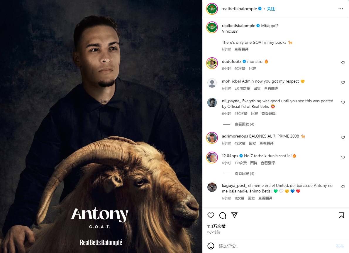 赛后,贝蒂斯官方晒出安东尼与山羊(GOAT)的P图,配文:“姆巴佩?维尼修斯?我的字典里只有一位GOAT